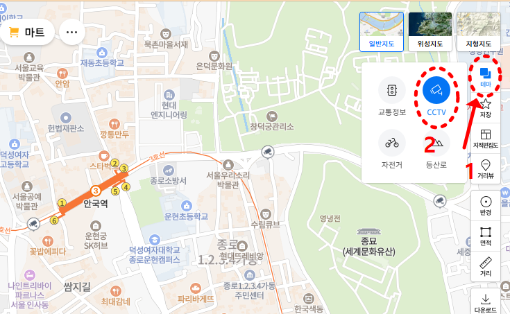 - CCTV 활성화: 오른쪽 위로 보시면 여러 개의 옵션버튼이 보입니다. 여기서 '테마'를 선택하시고 다시 나오는 창에서 'CCTV' 옵션을 선택합니다.